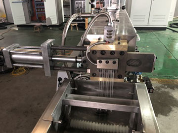 Ванну охлаждения для стренг, в которой полимер охлаждается для требуемой температуры, чтоб их можно было разрубить во фрезерной дробилке (стренгорезка);