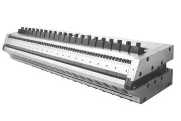 Каландровую систему валов, которая служит для калибровки толщины листа. Каждый вал оснащен мотор-редуктором с частотным регулированием оборотов вращения. В зависимости от выпускаемого листа можно использовать трех валковый или четырех валковый каландр. Валы хромированы и отполированы, а также оснащены жидкостным контуром для терморегулировки. Прижим валов каландра осуществляется гидравлическим или электрическим способом.