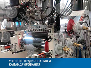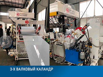Каландровую систему валов,  которая служит для калибровки толщины листа. Каждый вал оснащен мотор-редуктором с частотным регулированием оборотов вращения. В зависимости от выпускаемого листа можно использовать трех валковый или четырех валковый каландр. Валы хромированы и отполированы, а также оснащены жидкостным контуром для терморегулировки. Прижим валов каландра осуществляется гидравлическим или электрическим способом.